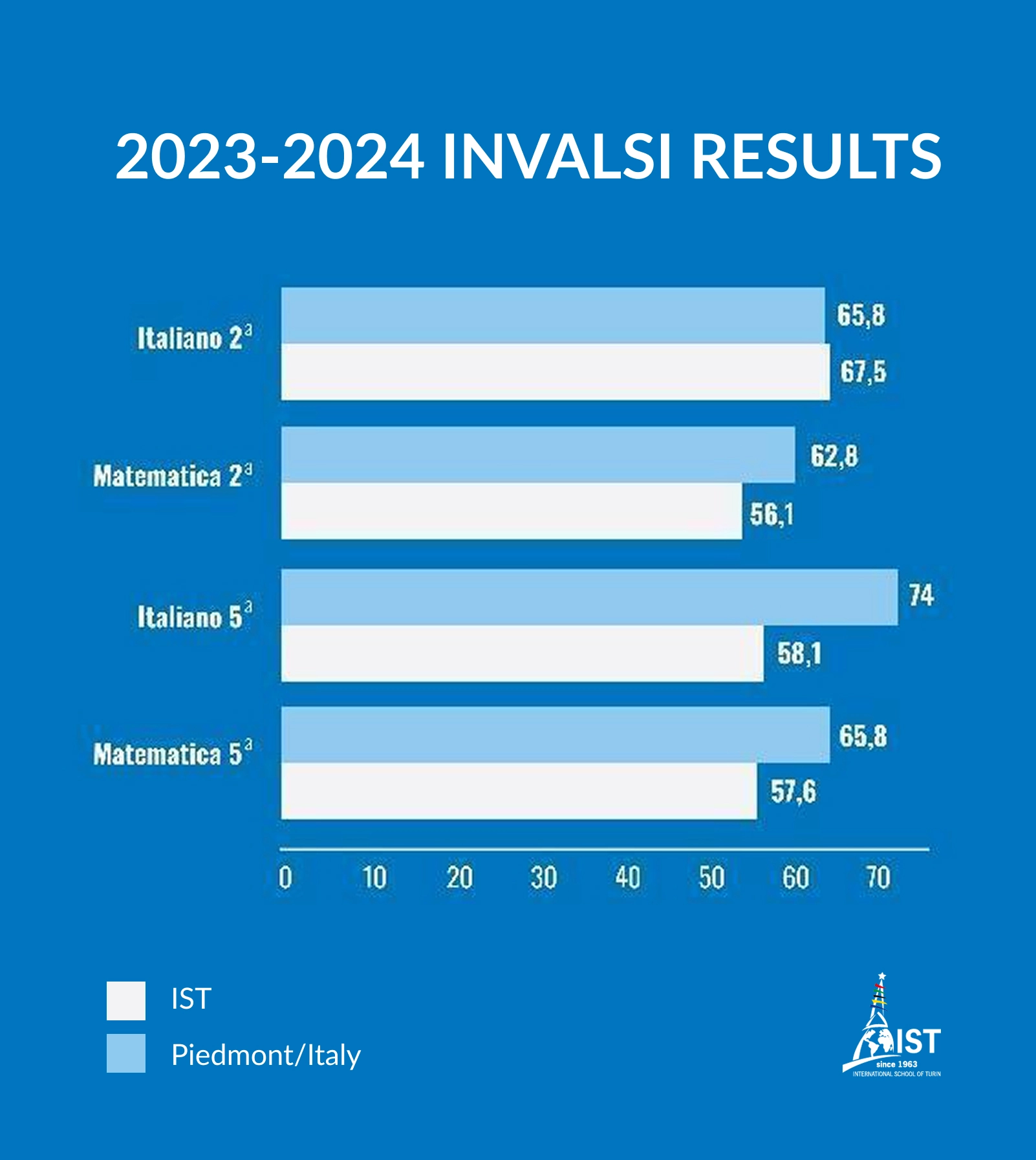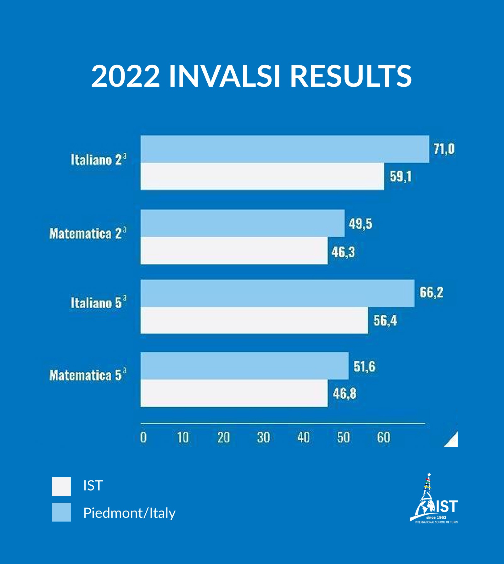 L’International School of Turin (IST) si distingue nei test INVALSI, con risultati superiori alla media regionale e nazionale, specialmente in italiano. Nella 5ª, l’IST ha raggiunto 74 in italiano (2023-2024) e 71 nel 2022, superando la media di oltre 10 punti. In matematica, i risultati sono stati variabili: nella 2ª, l’IST è passato da 46,3 (2022) a 62,8 (2023-2024), superando la media. Nella 5ª, la scuola ha mantenuto performance solide, con 65,8 nel 2023-2024.